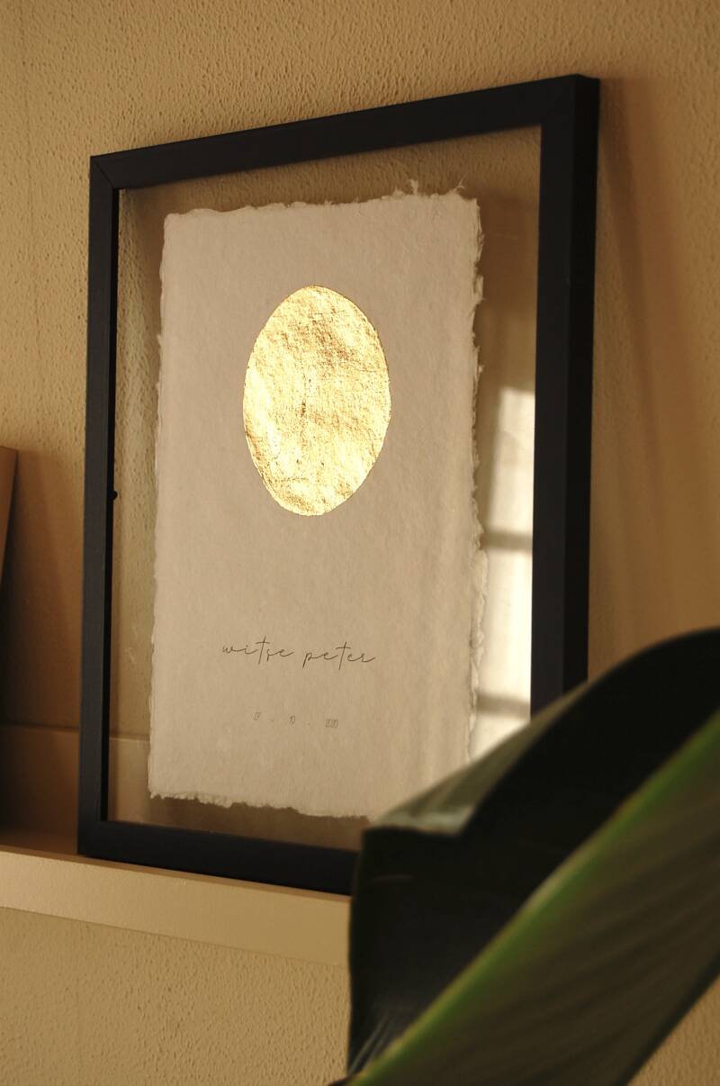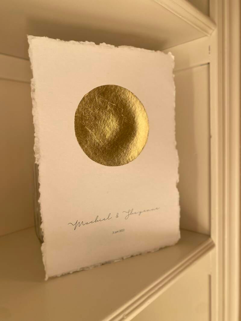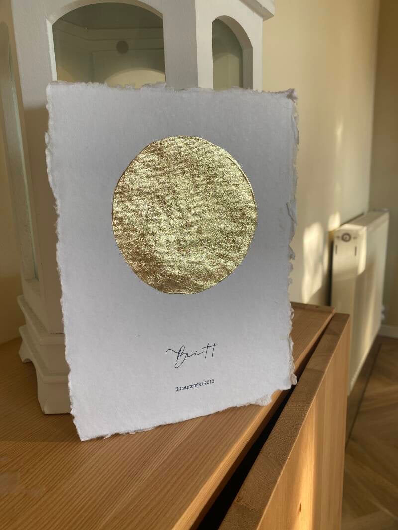 Een bijzondere dag vastgelegd door mij in een maanstandportret. Dit portret maak ik op maat met alleen gouden bladmetaal. Aan de hand van de door jouw doorgegeven datum maak ik een dierbare herinnering voor jou met de maanstand van die dag. Laat de geboortedag van een geliefde, een trouwdag, een dag van een bijzondere ontmoeting of een dag van afscheid vereeuwigen in een op maat gemaakte maanportret.