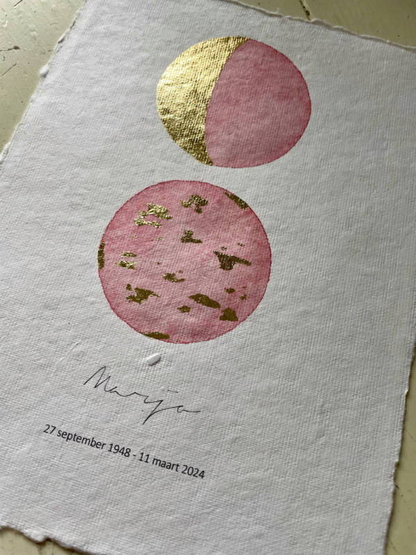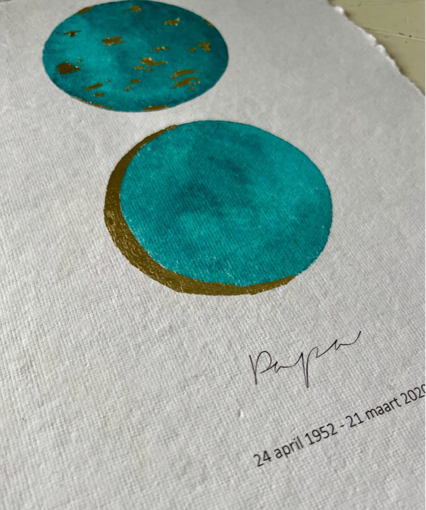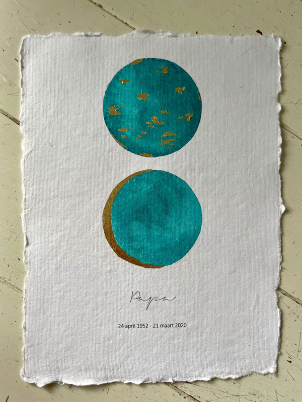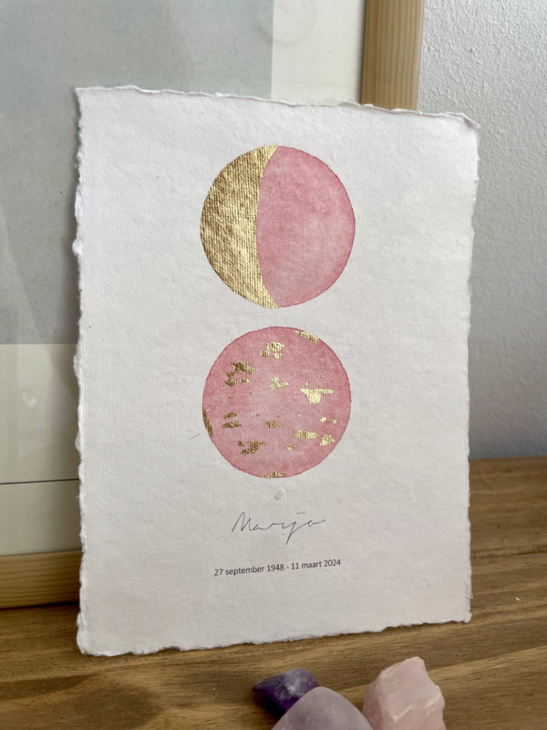 Na het verliezen van een dierbare kan het fijn zijn om een mooi aandenken te hebben. In een herinneringsportret leg ik twee bijzondere dagen vast in een maanstandportret met of zonder watercolor; de dag van geboorte en de dag van overlijden van een dierbare. De bovenste maan is de maanstand op de dag van geboorte, de onderste maan is de maanstand op de dag van overlijden. Dit portret maak ik op maat met gouden bladmetaal. Bij de optie met watercolor krijgt de schaduwkant van de maan een watercolorkleur.