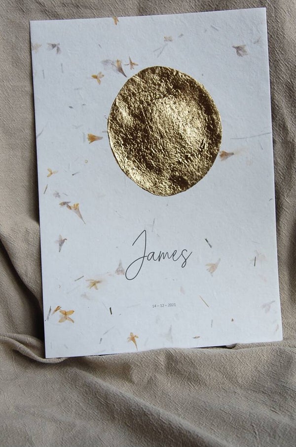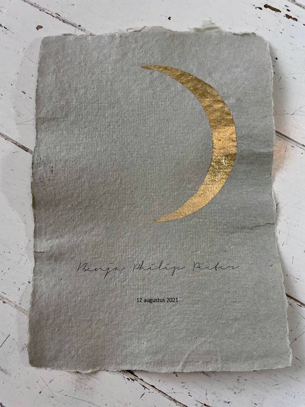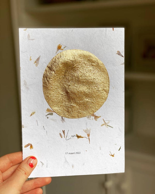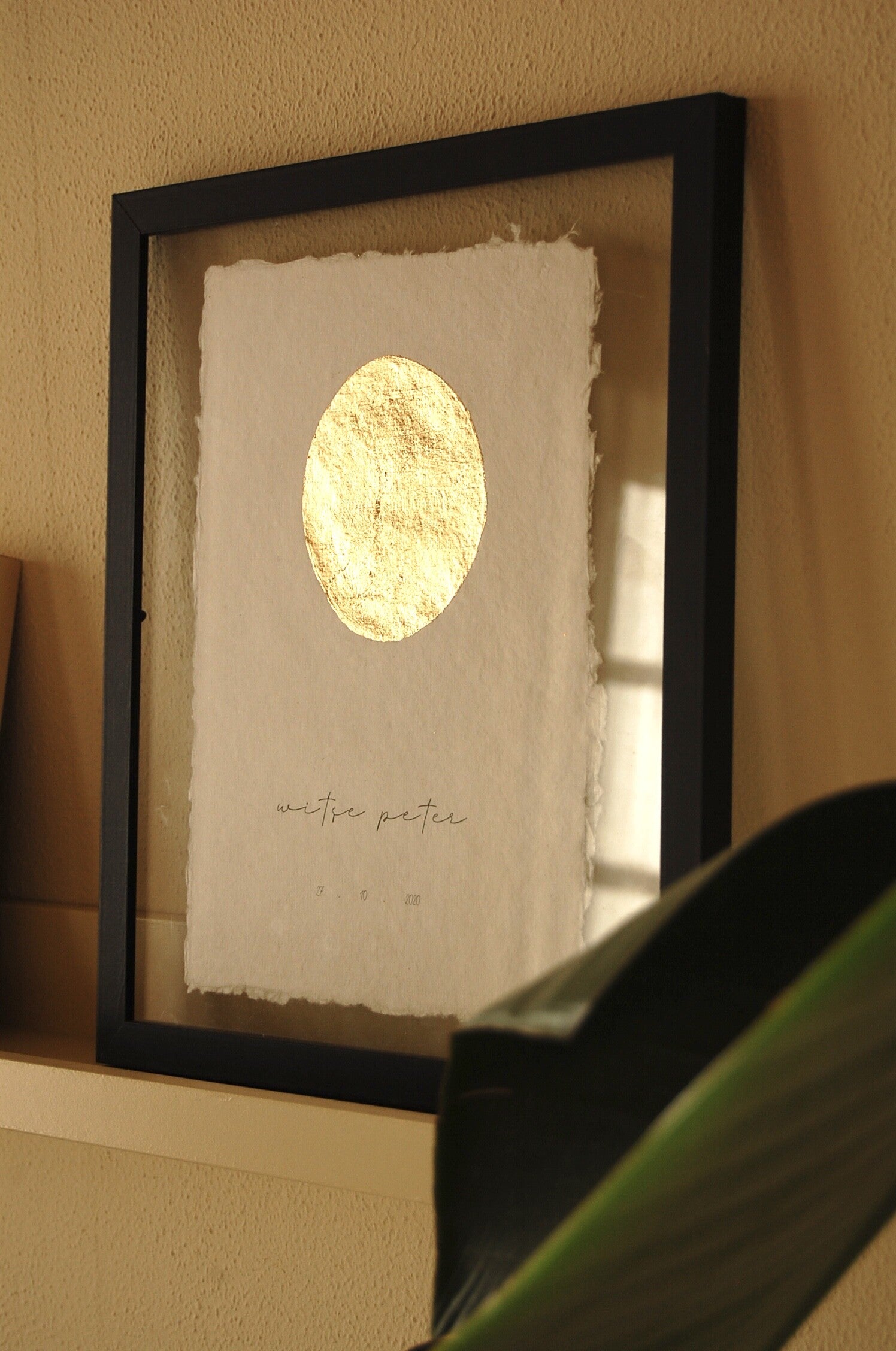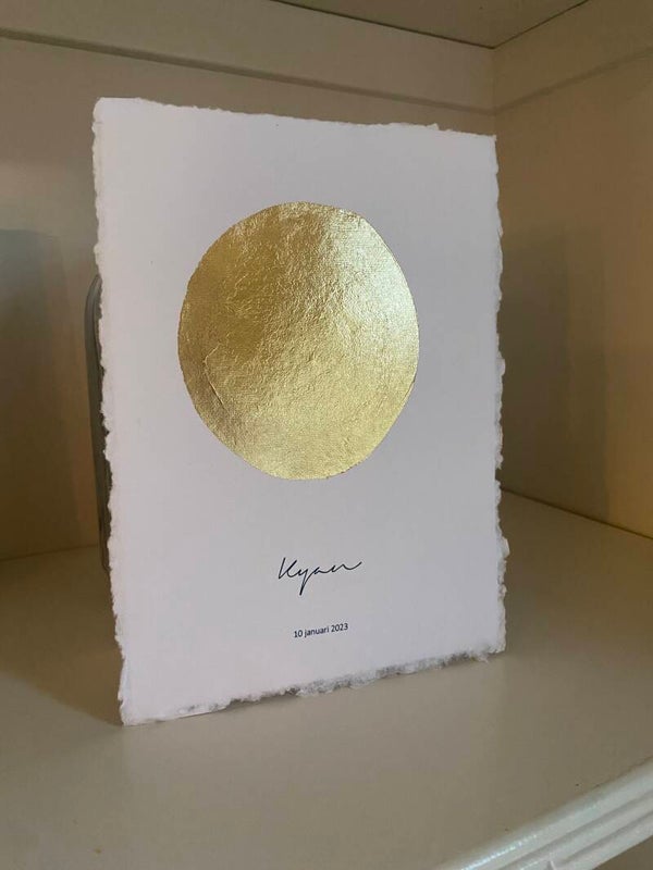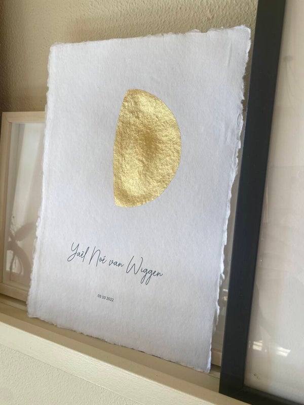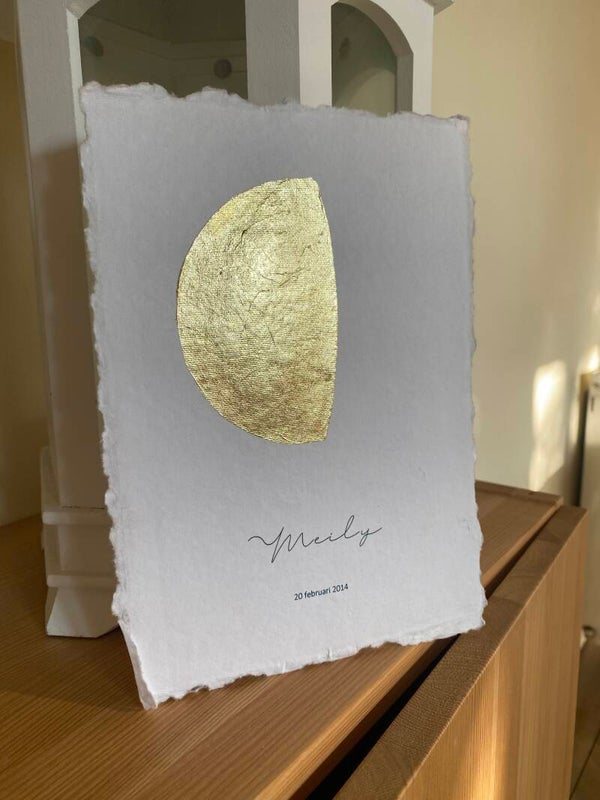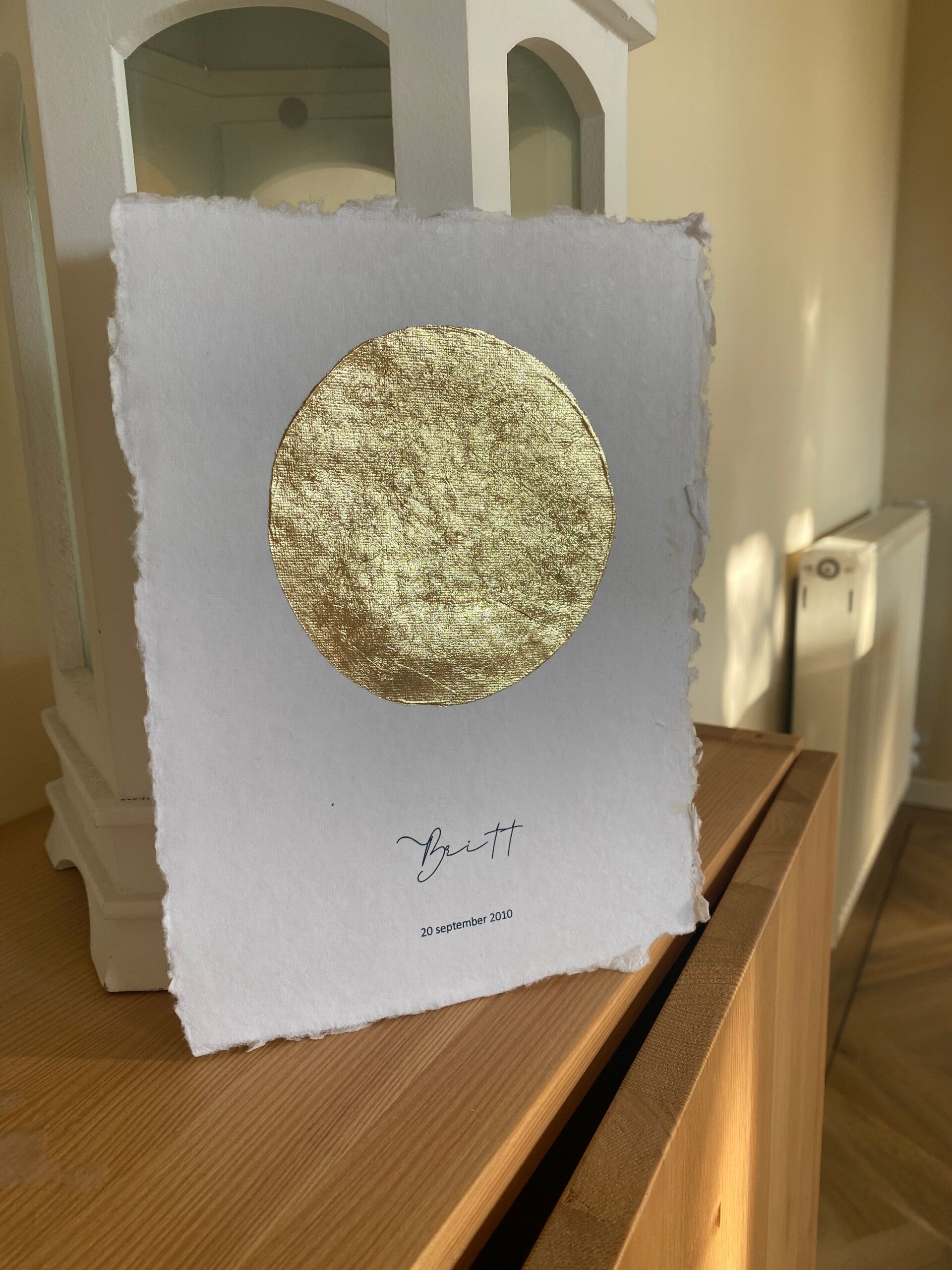 Een bijzondere dag vastgelegd door mij in een maanstandportret. Dit portret maak ik op maat met alleen gouden bladmetaal. Aan de hand van de door jouw doorgegeven datum maak ik een dierbare herinnering voor jou met de maanstand van die dag. Laat de geboortedag van een geliefde, een trouwdag, een dag van een bijzondere ontmoeting of een dag van afscheid vereeuwigen in een op maat gemaakte maanprint.