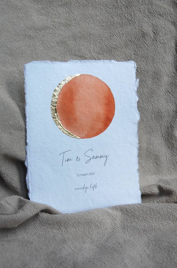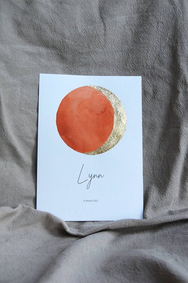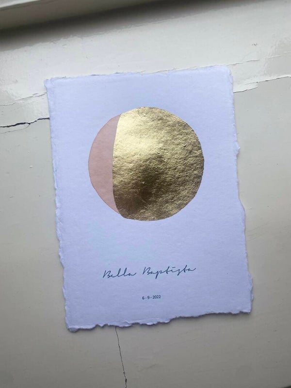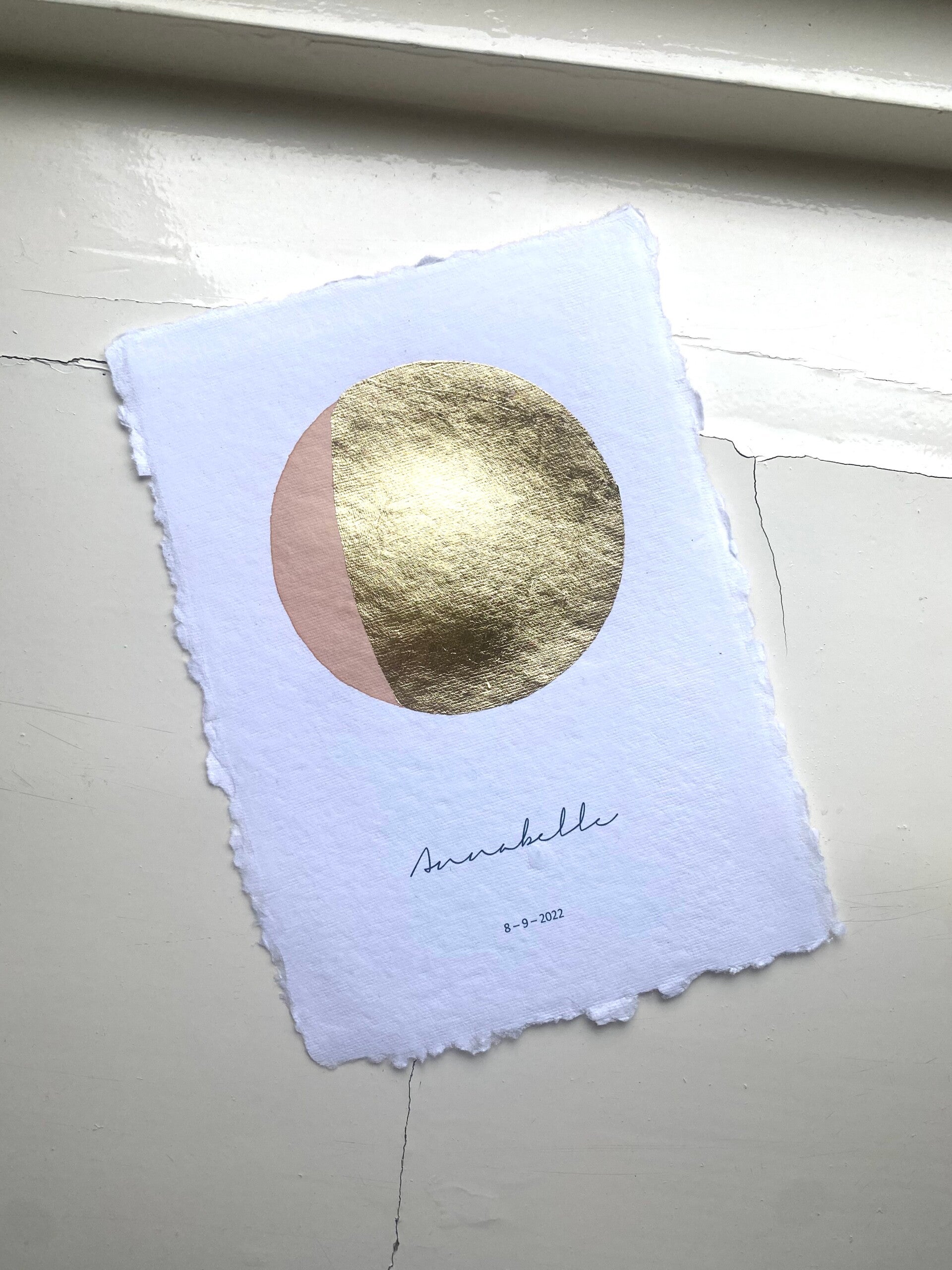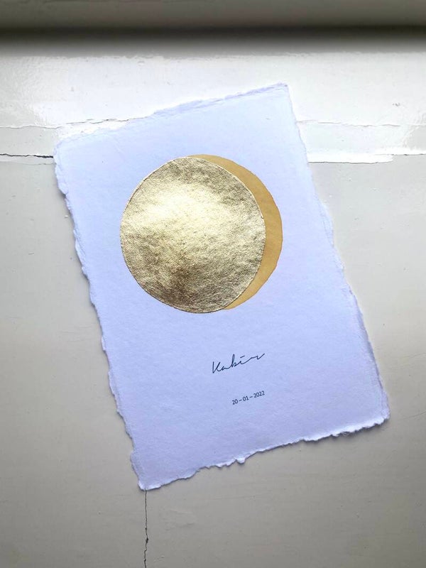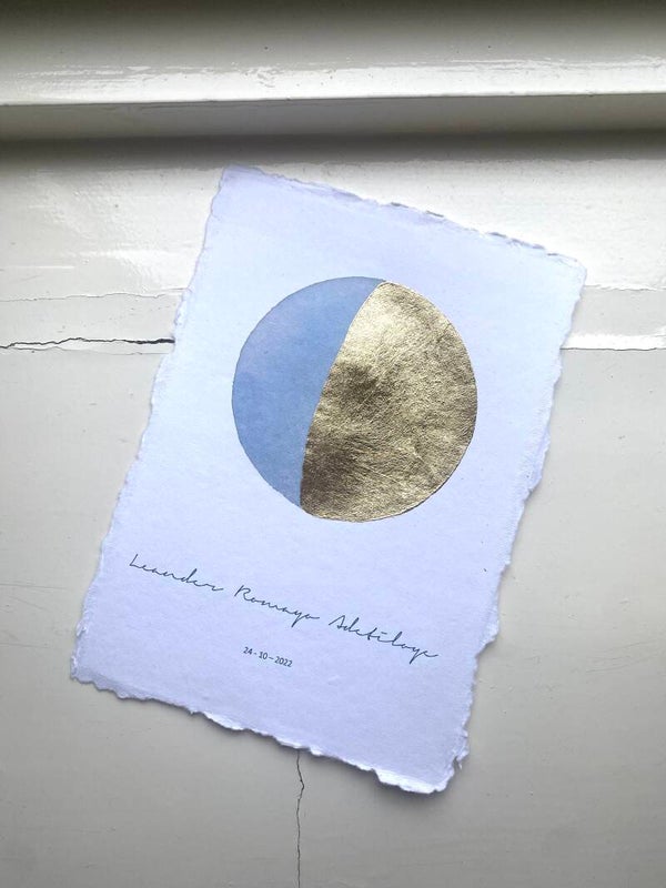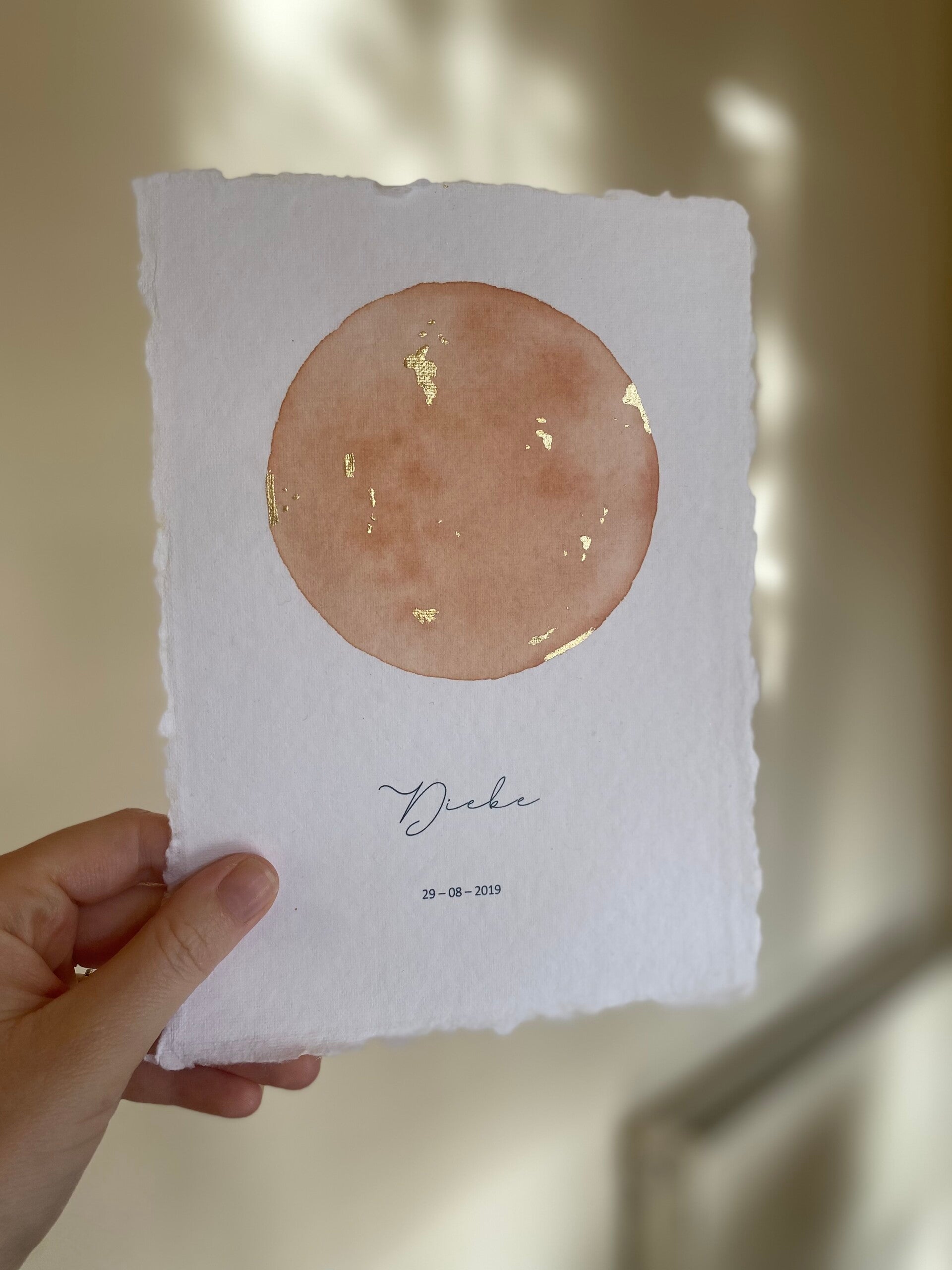 Een bijzondere dag vastgelegd door mij in een maanstandportret met watercolor. Dit portret maak ik op maat met waterverf en gouden bladmetaal. De schaduwkant van de maan krijgt een watercolorkleur. Aan de hand van de door jouw doorgegeven datum maak ik een dierbare herinnering voor jou met de maanstand van die dag. Laat de geboortedag van een geliefde of een dierbare, een trouwdag, een dag van een bijzondere ontmoeting of een dag van afscheid vereeuwigen in een op maat gemaakte maanprint.
