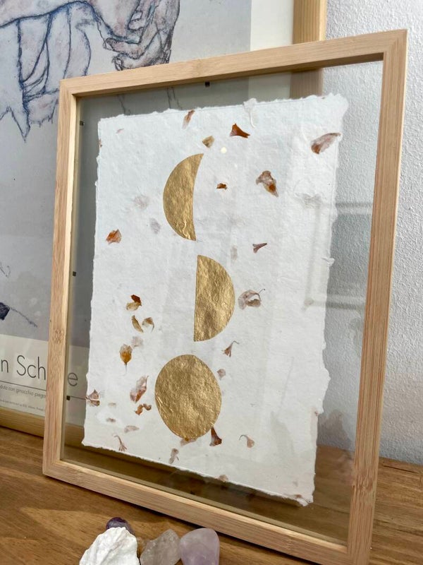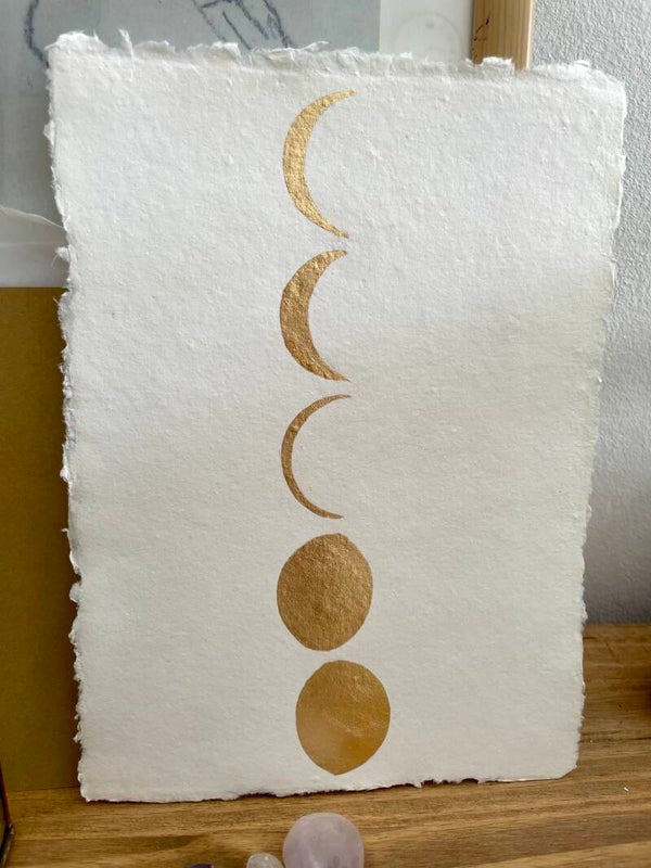 Een familieportret: meerdere maanstanden in één portret. Mogelijk met drie, vier of vijf maanstanden. Kan dienen als een gezinsportret, een vriendschap (vrienden- of vriendinnenportret) of als familieportret. Deze print maak ik op maat met alleen gouden bladmetaal. Aan de hand van de door jouw doorgegeven datums maak ik een dierbare herinnering voor jou.